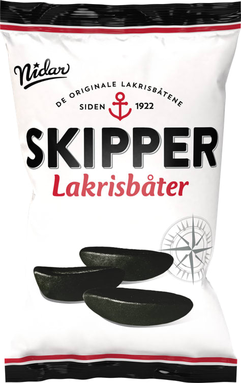 Nidar's liquorice boats last a long time "Kielland Lakrisbåter", but in 1983 the boats were named Skipper. Nidar's liquorice boats are pieces of drained, sweet, licorice gelé as both soft, slightly chewy and chewable.