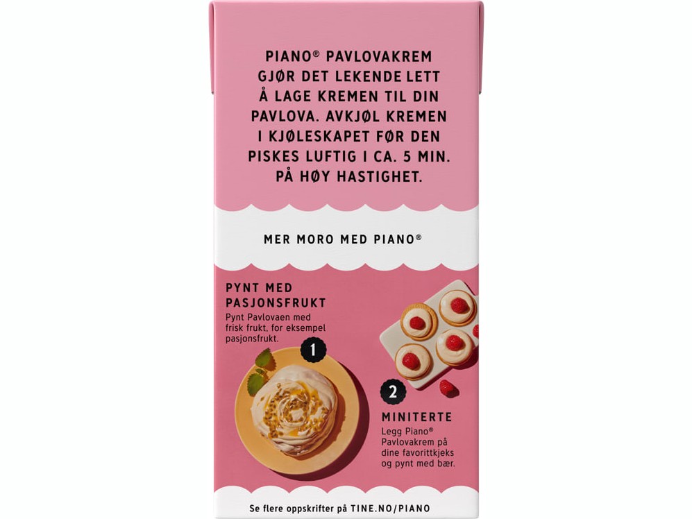 Ready-made pavlova cream that only needs to be whipped before being applied to the meringue base. Whipped Piano® Pavlova cream + ready-made meringue base + fresh berries = ready in ten minutes!