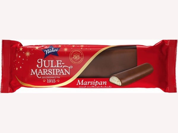 A single pack of Nidars Christmas marzipan stick covered in milk chocolate.