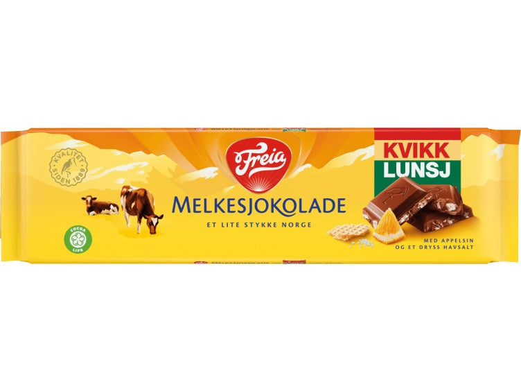 Freia Milk Chocolate with Kvikk Lunsj and orange is a delicious combination of Freia Milk Chocolate, pieces of Kvikk Lunsj biscuits, orange flavor and a sprinkle of sea salt. A great combination when you are exploring a little piece of Norway, either at home or on a trip, alone or with friends and family.