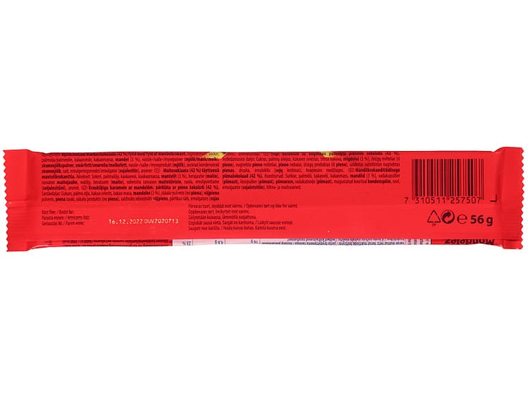 Sugar, palm oil, cocoa butter*, cocoa mass*, almonds (3%), whey powder (milk), skimmed milk powder, milk fat, whey product (milk), sweetened condensed skimmed milk, salt, emulsifier (soy lecithin), flavorings.