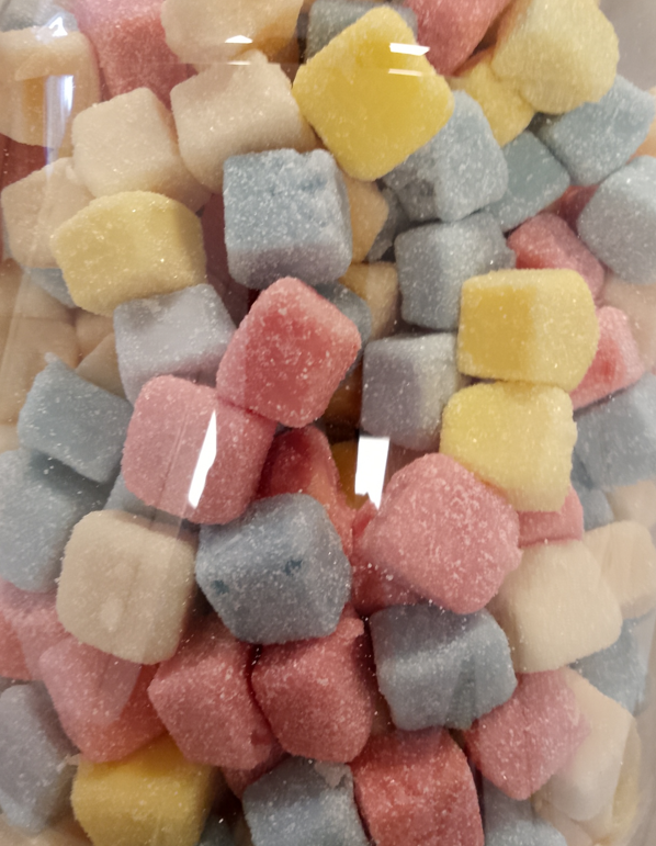 Myke, luftige skumkuber med friske fruktsmaker og et syrlig kick! Hver kube er som en liten sky av smak som kiler smakslĂžkene og fĂ„r deg til Ă„ smile (og kanskje lage et lite surmunn fĂžrst 😜). Perfekt for deg som elsker sĂžtt, surt og supermykt pĂ„ Ă©n gang – en ekte smaksfest i hver bit! 🎉✹